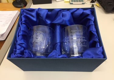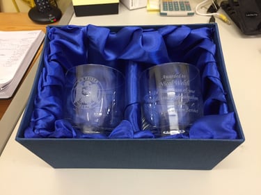 A pair of crystal Whisky Glasses in a satin presentation box. One will be engraved with the logo and one with the text (unless advised otherwise)