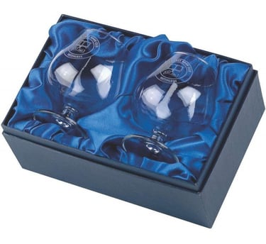 A pair of Brandy Balloons presented in a satin lined box. Both will be engraved, one with the logo & one with the text (unless advised otherwise)