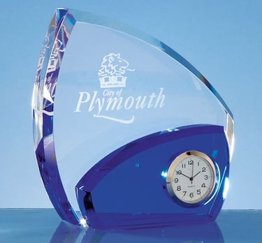 This 13.5cm clock is crafted out of clear optical crystal with sapphire blue detail. It has a large engraving area that can be personalised with the wording & logo