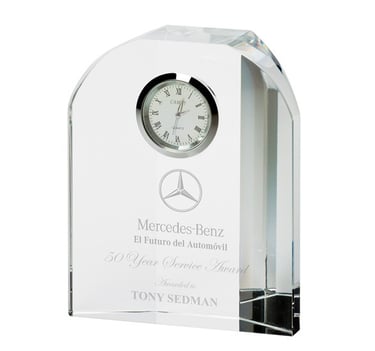 Lovely clock crafted out of clear optical crystal with engraving area that can be personalised with the wording & logo
