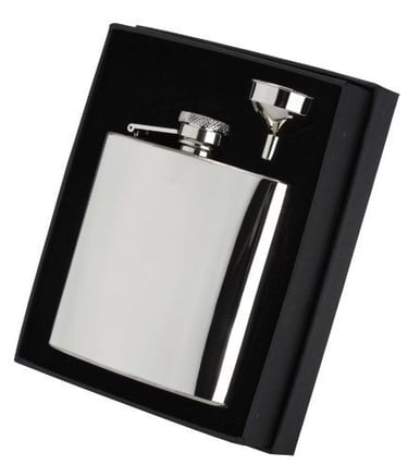This is a 6oz stainless steel Hip Flask presented in a box with its own funnel. The flask can be engraved front & back with text & chosen logo.