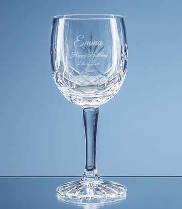 This pair of Wine Glasses will be presented in a satin lined box. One glass will be engraved with the logo and the other with the text (unless stated otherwise)
