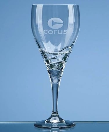 Crystal Wine Goblet in a satin presentation box. One will be engraved with the logo and one with the text (unless advised otherwise)